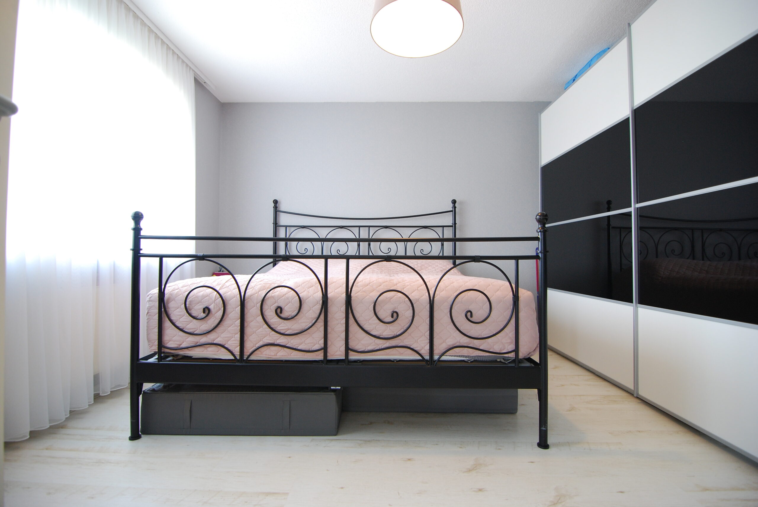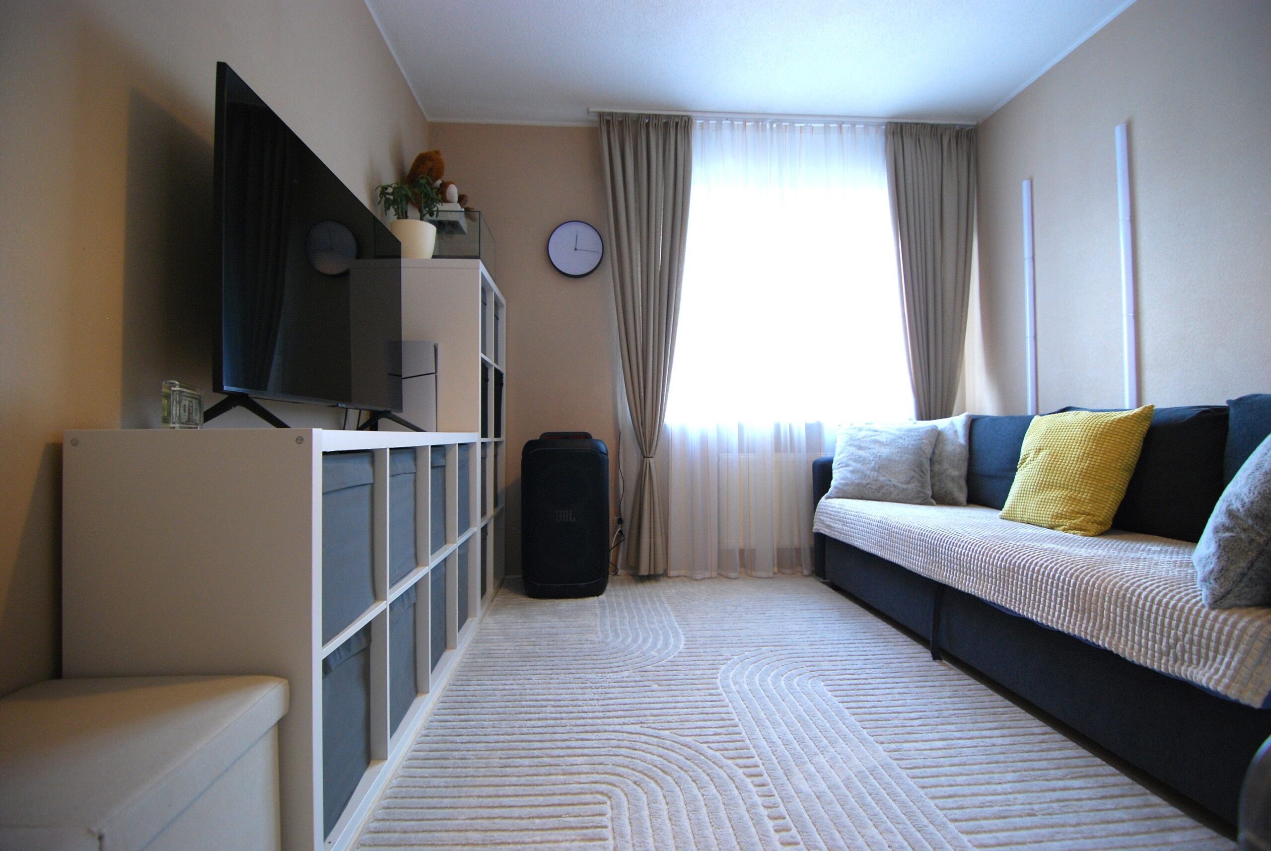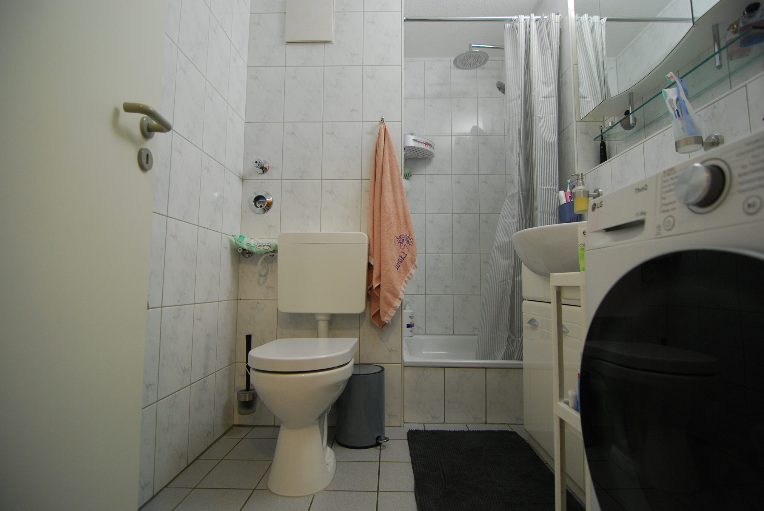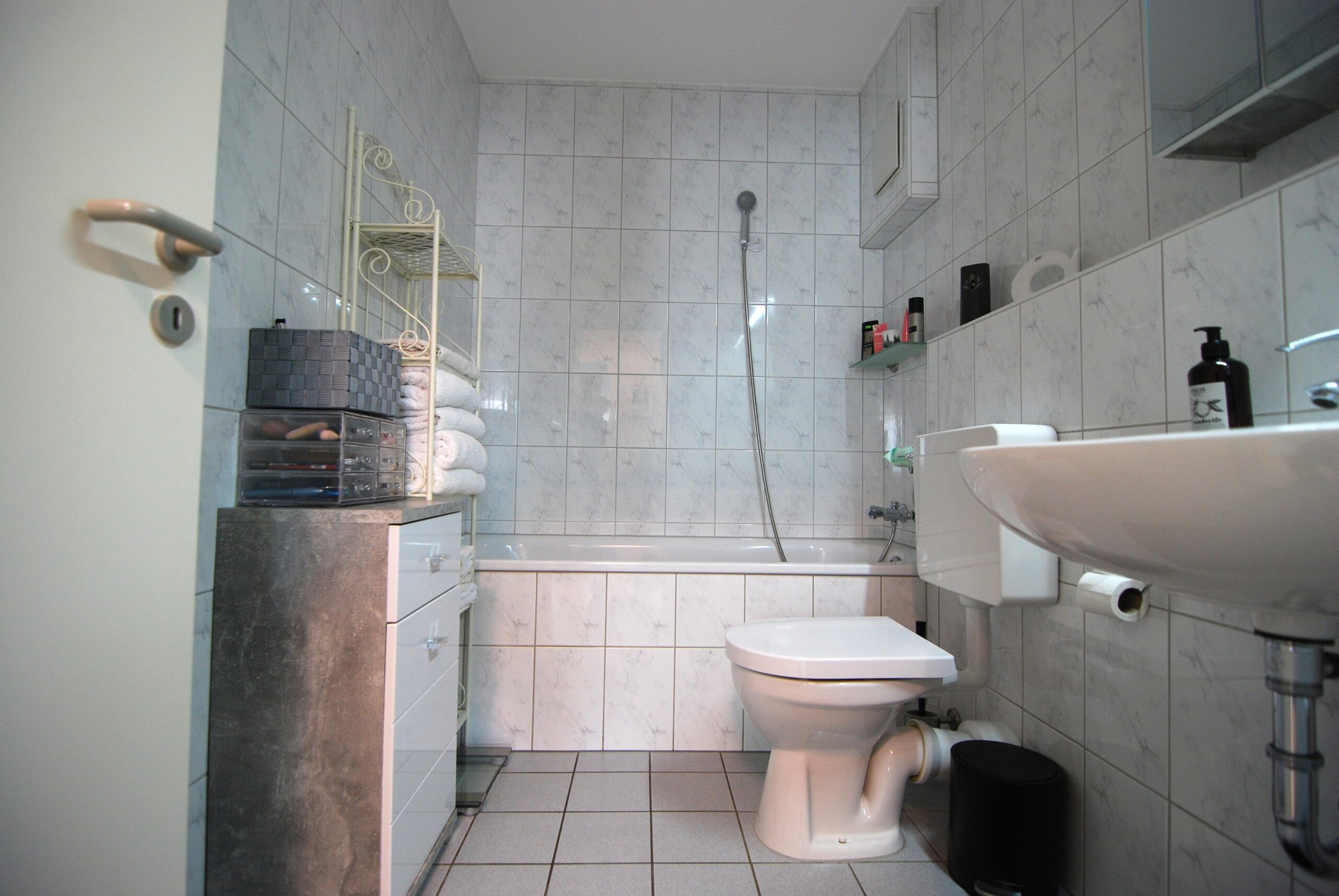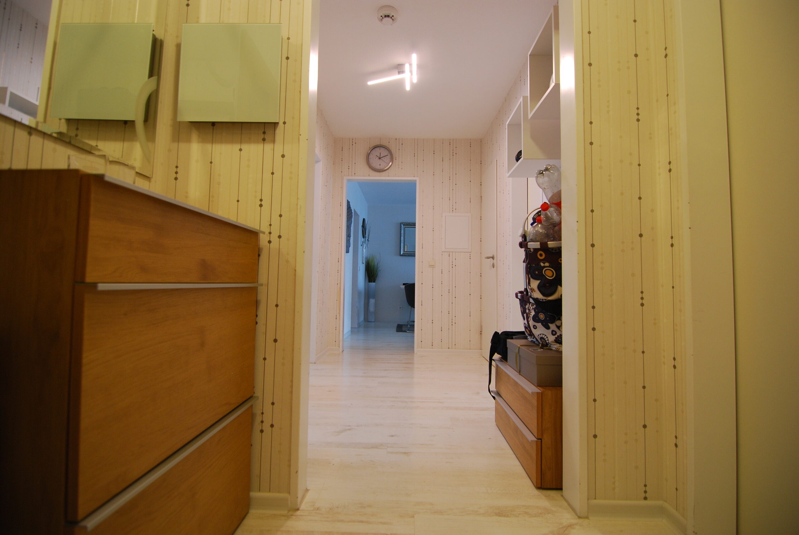 Im Wohn- und Essbereich, in den Schlafzimmern sowie im Flur wurde vom Vormieter ein heller Laminatboden verlegt, der bei Interesse privatrechtlich übernommen werden kann. Die Küche ist mit einem grauen PVC-Boden in Fliesenoptik ausgestattet, ebenfalls vom Vormieter verlegt und übernehmbar. In den Bädern sorgt ein klassischer weißer Fliesenboden für eine pflegeleichte Oberfläche.