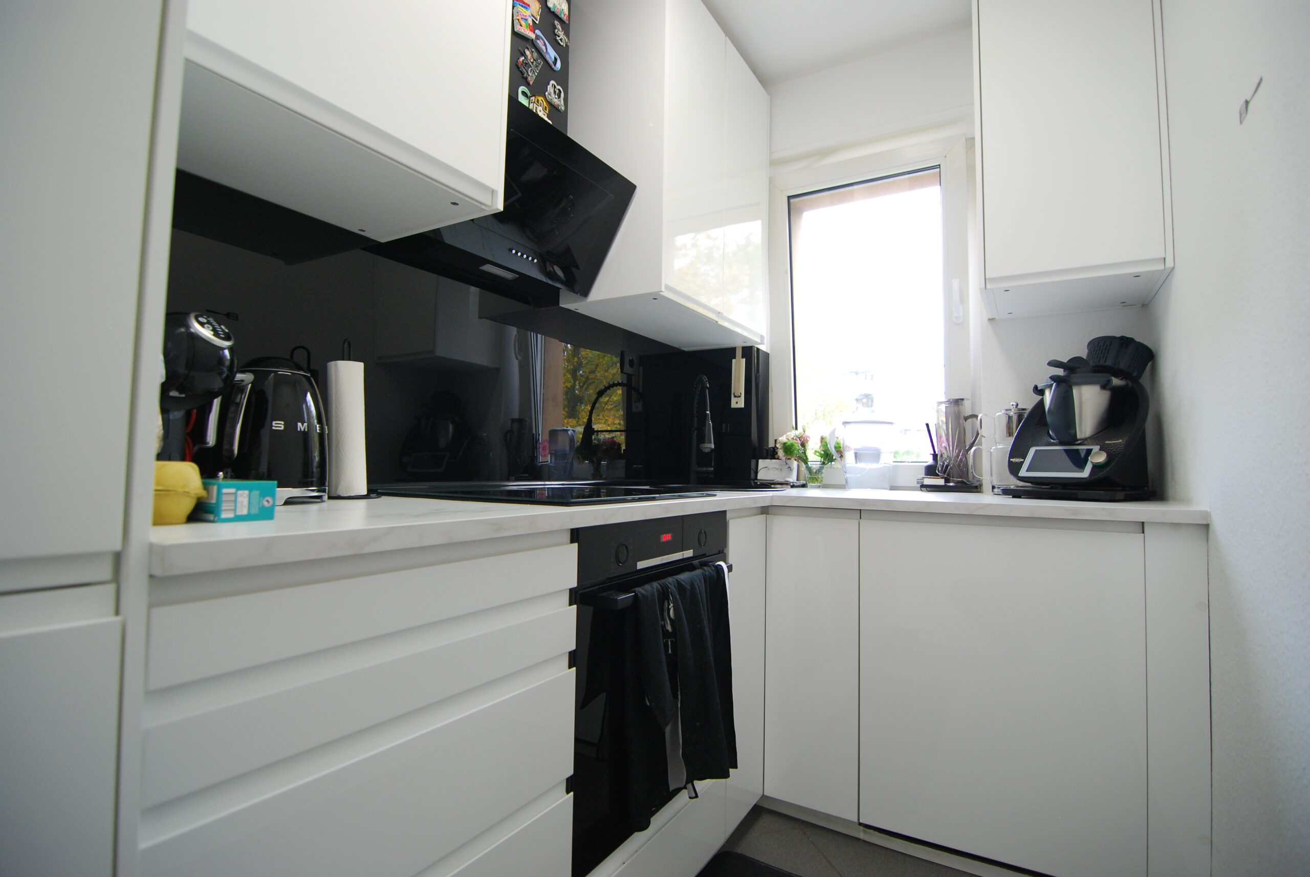 Küche: Seitens des Vermieters ist im Bereich der Küchenzeile ein Fliesenspiegel mit weißen Fliesen vorhanden. Dieser ist derzeit durch eine Platte in Klavierlack-Optik verdeckt.